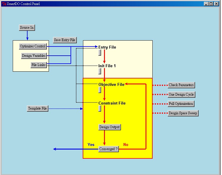 Control Panel 為圖形化 (計算及設定流程) 控制面版,透過 Control Panel,模型設定與計算流程一目瞭然,用戶可使用按扭及對話框進行參數與模型設定,並執行最佳化流程導覽、參數控制與設定、外部軟體聯結設定,整合流程測試,最佳化計算執行與計算結果顯示等功能。