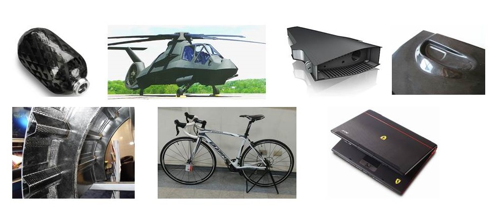 複合材料由於其優勢的單位重量強度比例,以及方便複雜曲面工件製造,已經廣泛應用於許多產品,包括國防,航太,汽車,電子消費產品與運動器材等。 將金屬鈑件轉換成複合疊層材料時,在相同強度下通常能有極為顯著的減重效果。圖1所示為複合疊層材料常見之產品應用