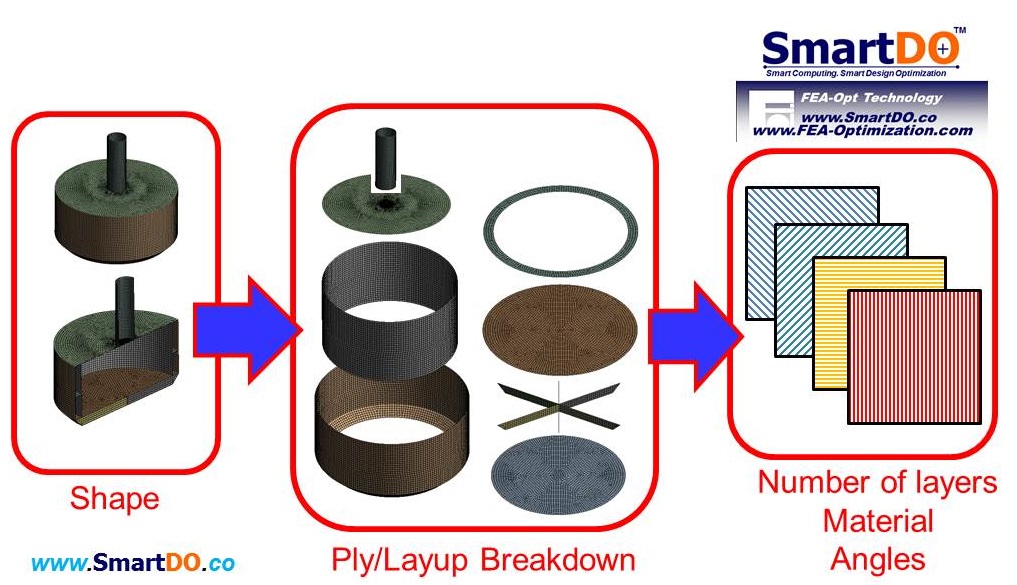 外形(Shape)的設計:通常受限於產品之造形設計考量,或是如空氣動力性能之考量,一般來說疊層設計必需符合這些要求。如果工件外形可以自由設計,一般亦可先 使用一般均質材料(如金屬)作為設計材料,建立參數化模型以進行形狀設計(Shaping)最佳化。SmartDO亦提供了穩定的自動參數優化模組,包括SmartLink for ANSYS Workbench 及SmartLink for NX CAE。