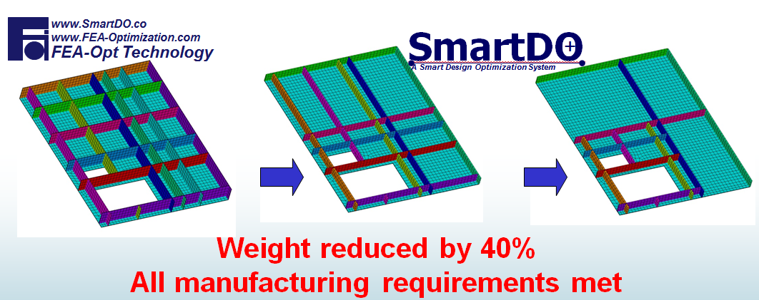 航空棧板置於貨運機上,必需儘可能輕量化。如果是軍事用途,通常還需考慮耐久性,故有時會以鋁鑄件製造。在此例中為了考慮大量生產之可能,除了減重,還必須考慮眾多製造限制條件。 一般優化軟體難以考慮太多條件,但SmartDO可把所有可量化條件皆列入設計考量。在此案中,SmartDO成功減重40%,並且符合所有製造條件要求,為一具革命性之創新設計。