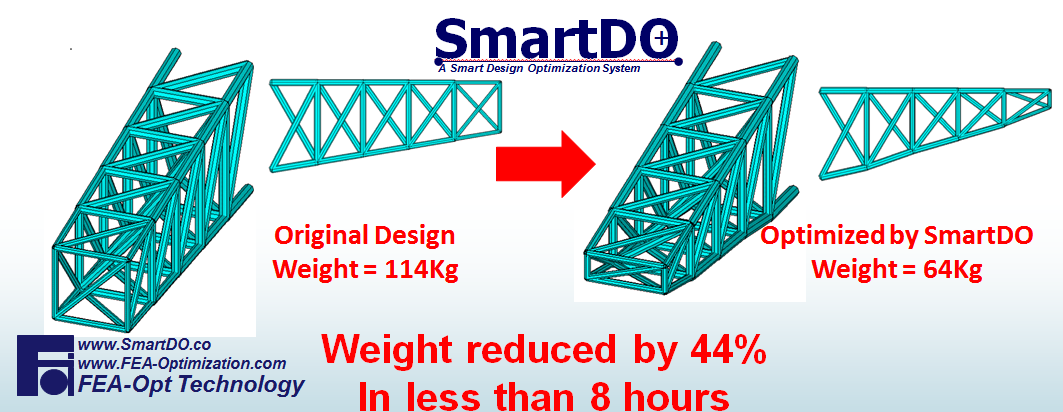 懸臂結構物除了有較嚴苛的載重條件,一般其本身自重即會造成支撐點極大的負擔,且對承受地震力頗為不利。為了安全性及成本考量,針對結構物進行輕量化是迫切的需求。 本案例之結構桁架,因同時考慮外型及每個桿件的厚度,直徑與應力,共有多達136設計變數與132個設計條件。一般優化設計軟體根本完全無法處理這樣龐大的工程運算問題。但經SmartDO數小時的運算後, 成功減重44%,並符合所有強度要求。