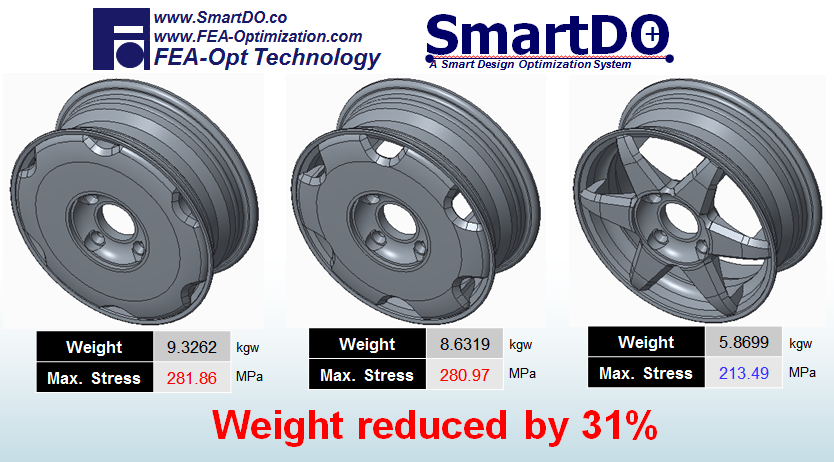 汽車輪圈在上市前需要經過多樣結構可靠度測試。製造商經常為了得到一個可以通過強度要求的設計,需要參考大量過去經驗並經過長時間設計迭代與試誤。 SmartDO的強大演算法,可以讓輪圈製造公司省下大量時間與成本。在本案例中,客戶可以從一個非常基本的草圖開始,讓SmartDO自動完成優化設計;除了在CAE軟體驗證上通過所有 的強度驗證,並成功減重31%。