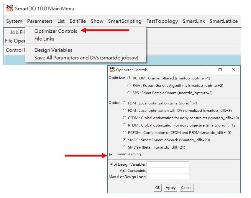 SmartLearning應用機器學習原理,從已經計算過的資料中,儘可能減少計算量。自SmartDO 10.0開始,SmartLearning被設定為微分梯度法的預設選項,故用戶無須另行開啟SmartLearning (RGA求解器原本即有類似功能)。 測試結果顯示,使用SmartLearning一般可將計算時間減少約15%~40%,且與無SmartLearning相較,仍得到一樣的結果。SmartLearing是RCFDM求解器的新增加強功能,無需額外購買license或模組。