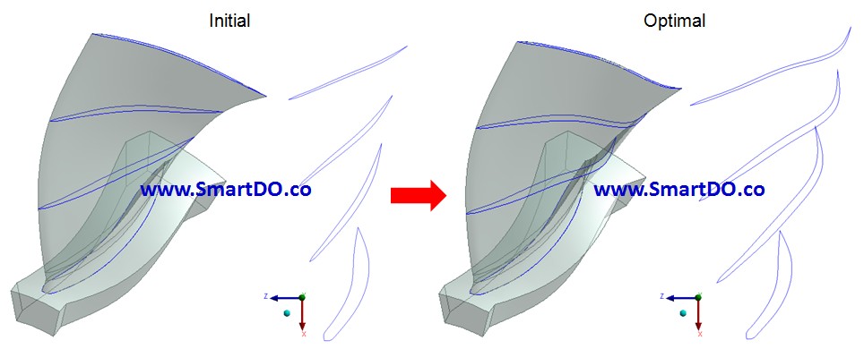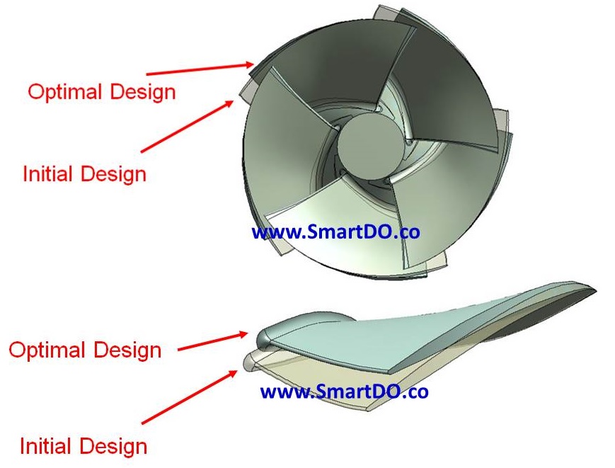 圖3所示為某電廠之抽水幫浦,使用類似上一例子提到的方法,經SmartDO最佳化設計後之形狀改變。經過SmartDO的優化設計後,該幫浦葉片成功降低了21%的應力,同時增加了12%的抽水量